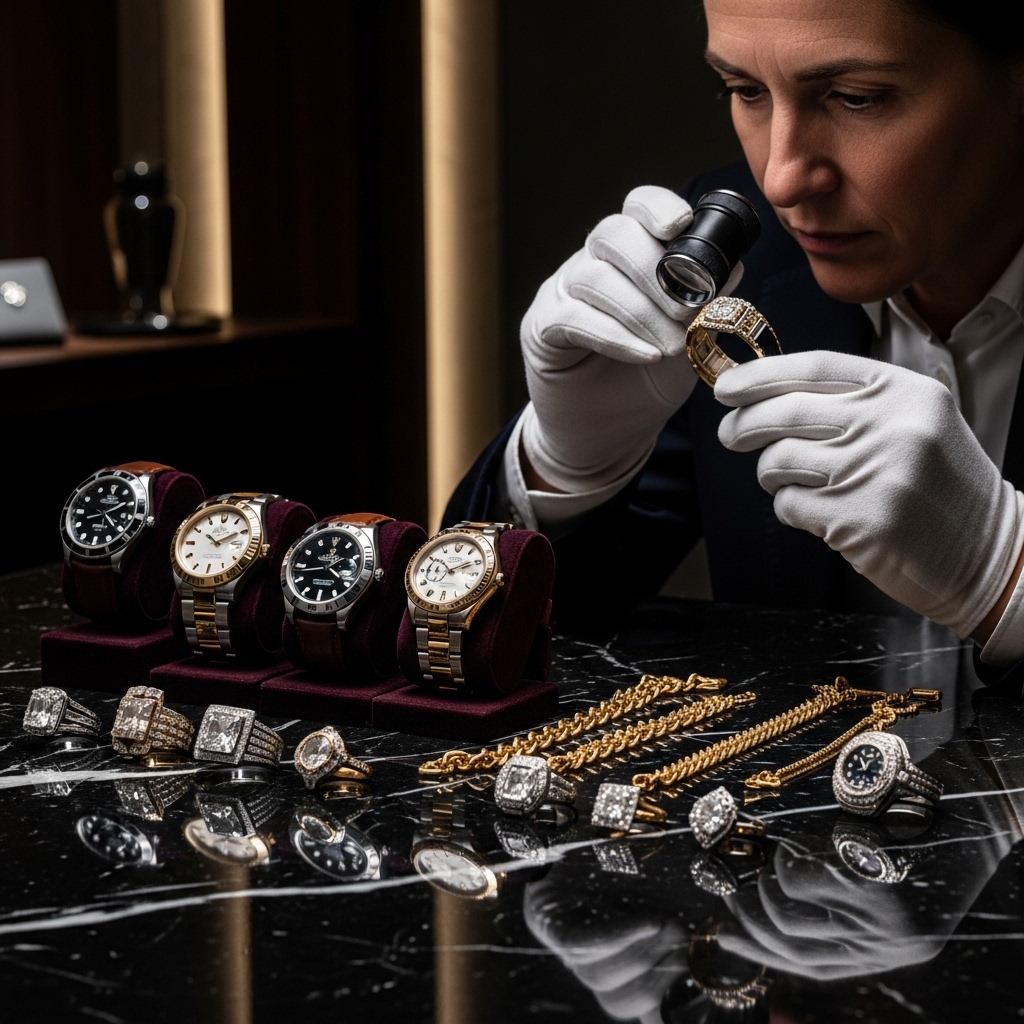 Um avaliador de joias analisa criteriosamente o valor de peças como anéis, colares, pulseiras e relógios de luxo, considerando fatores como peso, pureza do ouro, quilates e autenticidade das pedras preciosas.